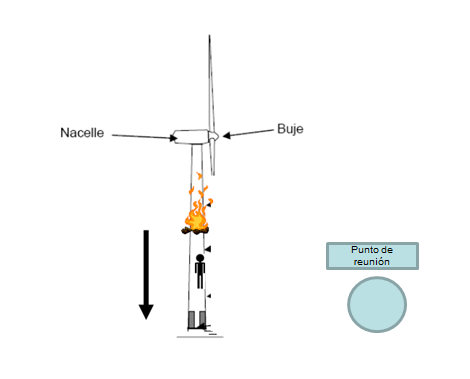 Una vez en nacelle, el trabajador procedería a la evacuación por el exterior del aerogenerador con el  descensor de emergencia manual o automático hasta la base del mismo (playa). Posteriormente se  trasladará a punto de reunión prefijado  en caso de emergencia evitando que pueda alcanzarle  cualquier objeto que pueda precipitarse desde la parte superior del aerogenerador.