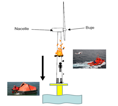 En el caso de los aerogeneradores offshore, una vez en el ground, los trabajadores accederían la plataforma exterior de acceso bien para ser transferidos a embarcación de rescate o bien en último caso y en ausencia de ésta para emplear las balsas salvavidas de emergencia y los trajes de inmersión para  evacuar el aerogenerador.