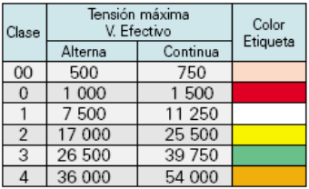 Las equivalencias entre las clases del guante y las tensiones máximas de utilización son las siguientes: